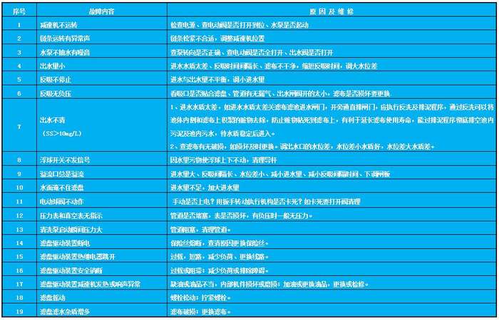 五、纖維轉(zhuǎn)盤濾池-纖維轉(zhuǎn)盤過濾裝置培訓(xùn)計劃 1、目的 使用戶操作和維修人員了解掌握纖維轉(zhuǎn)盤濾池-纖維轉(zhuǎn)盤過濾裝置設(shè)備的工作原理、結(jié)構(gòu)組成、運行操作、程序設(shè)定、故障排除、維護(hù)保養(yǎng)等技能。 2、內(nèi)容 1)纖維轉(zhuǎn)盤濾池-纖維轉(zhuǎn)盤過濾裝置的工作原理。 2)纖維轉(zhuǎn)盤濾池-纖維轉(zhuǎn)盤過濾裝置的進(jìn)水水質(zhì)控制。 3)纖維轉(zhuǎn)盤濾池-纖維轉(zhuǎn)盤過濾裝置的各部件的結(jié)構(gòu)組成。 4)纖維轉(zhuǎn)盤濾池-纖維轉(zhuǎn)盤過濾裝置的運行操作方法。 5)纖維轉(zhuǎn)盤濾池-纖維轉(zhuǎn)盤過濾裝置的電氣原理和程序的設(shè)定。 6)纖維轉(zhuǎn)盤濾池-纖維轉(zhuǎn)盤過濾裝置的常見故障和排除方法。 7)纖維轉(zhuǎn)盤濾池-纖維轉(zhuǎn)盤過濾裝置的維護(hù)及保養(yǎng)。 六、纖維轉(zhuǎn)盤濾池-纖維轉(zhuǎn)盤過濾裝置控制系統(tǒng)操作說明 1、手動自動方式選擇 將控制柜手動/自動旋鈕擰在“手動“位置,根據(jù)面板上的按鈕來控制啟停;將開關(guān)旋至”自動“位置,系統(tǒng)根據(jù)設(shè)置的程序自動運行。 2、自動控制方式 將控制柜手動/自動開關(guān)旋至“自動”位置,觸摸屏手動/自動切換按鈕也在“自動”狀態(tài),自動準(zhǔn)備工作就緒,程序自動完成以下功能: 反洗根據(jù)液位和時間兩種設(shè)置運行(液位先到根據(jù)液位反洗,時間先到根據(jù)時間反洗,以前者為工作條件當(dāng)運行開始后后者時間重新開始計時)。另外還有高位浮球保護(hù)當(dāng)液位失靈水位上升接觸到高位浮球后就開始反洗程序。 自動反洗: 排泥:啟動排泥閥,閥開到位后,1#反洗泵開始工作吸泥。當(dāng)排泥時間(時間可在參數(shù)界面設(shè)置)到,排泥完成進(jìn)入清洗。 注明:排泥閥排泥過程中按需要時間長短可設(shè)置。從排泥到清洗過程中轉(zhuǎn)換閥門時污泥泵不停止。反洗閥清洗時間都可在文本上設(shè)置。液位的量程和高低液位也可在屏幕上設(shè)置。 七、纖維轉(zhuǎn)盤濾池-纖維轉(zhuǎn)盤過濾裝置注意事項 1、用戶在使用前應(yīng)仔細(xì)閱讀說明書,嚴(yán)格按說明書要求使用水泵。 2、每個抽吸水泵在啟動的時候保證所對應(yīng)的閥門中有一個處于完全打開狀態(tài)才能啟動。 3、觸摸屏上的參數(shù)禁止隨意調(diào)整,如有調(diào)整,請加強(qiáng)巡視,確保調(diào)整后設(shè)備正常運行。 4、如要長時間停用設(shè)備或檢修設(shè)備,應(yīng)執(zhí)行反洗程序,通過反洗可以將池體內(nèi)側(cè)和濾布上積聚的臟物去除,防止贓物干后粘死到濾布上,有利于延長濾布使用壽命。 八、纖維轉(zhuǎn)盤濾池-纖維轉(zhuǎn)盤過濾裝置電氣部分設(shè)備維護(hù) 每3個月檢查電氣柜內(nèi)的接線端子是否有松動現(xiàn)象,有此現(xiàn)象時應(yīng)當(dāng)緊固接線端子,當(dāng)電氣部分發(fā)生故障后,應(yīng)依照電氣原理圖,檢查電氣線路是否正常,空開是否有跳閘現(xiàn)象,保險有無燒斷,找到原因并解決問題后方能重新上電。 減速機(jī),泵電機(jī)每個3個月加一次潤滑油,電動閥執(zhí)行機(jī)構(gòu)定期加黃油,防止生銹。 九、纖維轉(zhuǎn)盤濾池-纖維轉(zhuǎn)盤過濾裝置冬季運行注意事項 1、用戶必須在冬季來臨前對設(shè)備外圍管道、電動閥體、水泵做防凍保溫處理。 2、冬季停機(jī)時,設(shè)備外圍管道、電動閥體、水泵長時間裸露在外,管道內(nèi)的水處于靜止?fàn)顟B(tài),即使在有保溫設(shè)施時也可能出現(xiàn)凍裂現(xiàn)象;針對此情況,在用戶保證正常提供進(jìn)水情況時,請在在控制系統(tǒng)界面點擊1#系統(tǒng)或者2#系統(tǒng)手動反洗程序按鈕(運行方式與自動方式相同)確保設(shè)備正常。 3、冬季停機(jī)時,用戶不能保證正常提供進(jìn)水時,應(yīng)當(dāng)排空濾池內(nèi)水,并且將設(shè)備外圍管道、電動閥體、水泵內(nèi)的水排空,防止凍裂閥門、管道、水泵。 4、用戶在室外溫度持續(xù)降低,應(yīng)判斷手動反洗程序能否保證設(shè)備外圍管道不被凍裂,有被凍裂可能時,應(yīng)提前排空過濾池內(nèi)水,并且將設(shè)備外圍管道、電動閥體、水泵內(nèi)的水排空,防止凍裂閥門、管道、水泵。